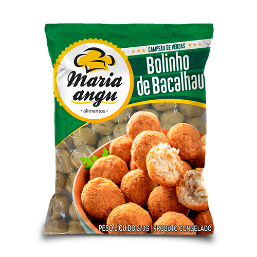 Petisco salgado congelado, com massa cozida à base de bacalhau para ser consumido frito por imersão em óleo, na air fryer ou assado.