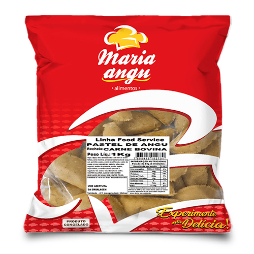 Petisco salgado congelado, com massa cozida à base de fubá, recheado com carne de bovina, para ser consumido frito ou assado em grelha.